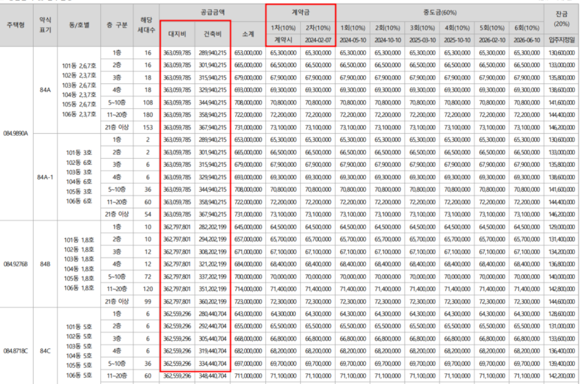 가장 선호도가 높은 84타입으로만 구성되며, 아직 평면도를 살펴보진 않았지만 84A타입이 가장 선호하는 타입일 것으로 판단되며 84B, 84C 중 하나는 비선호타입으로 분류가 되었을 것입니다.